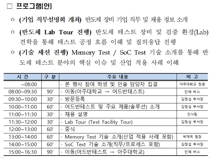 ㅇ 목적: 세계적 반도체 장비 기업의 Lab 방문을 통해 메모리·SoC 테스트 기술 흐름을 체험하고, 현업 엔지니어와 Q&A를 통해 실무 이해도 및 취업 동기 강화