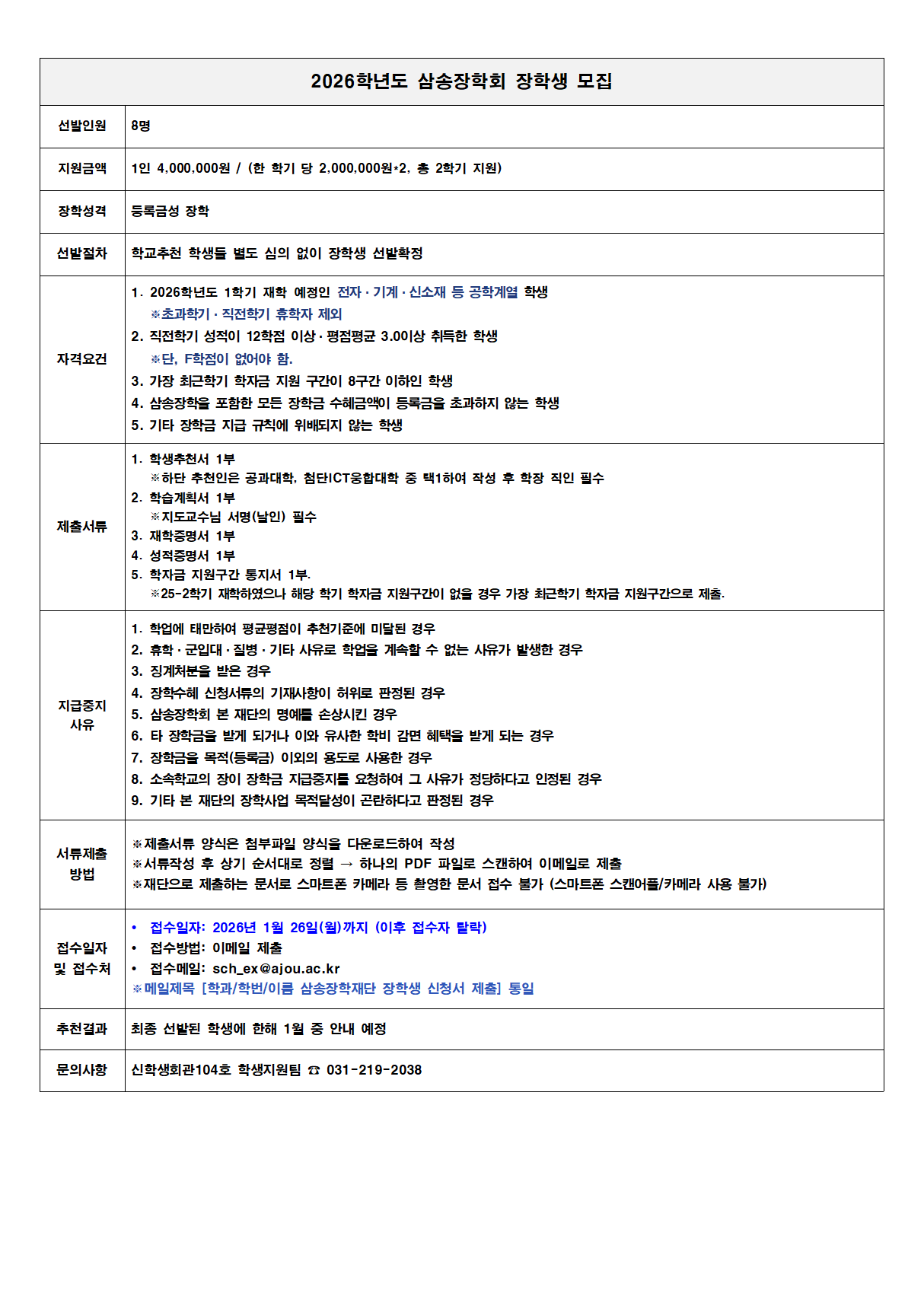 [교외장학] 2026학년도 삼송장학회 장학생 모집 공고(~01.26.(월)까지)