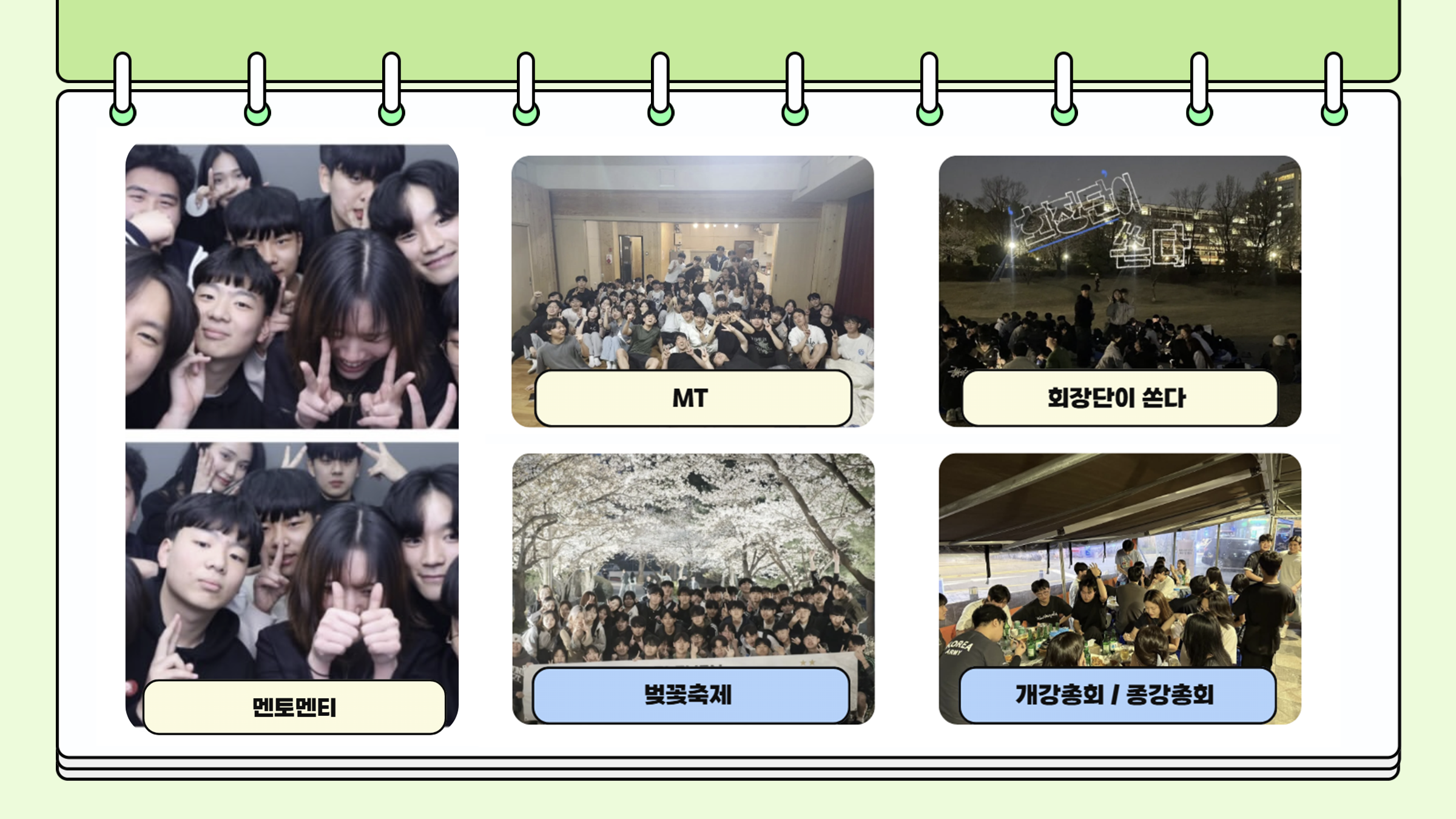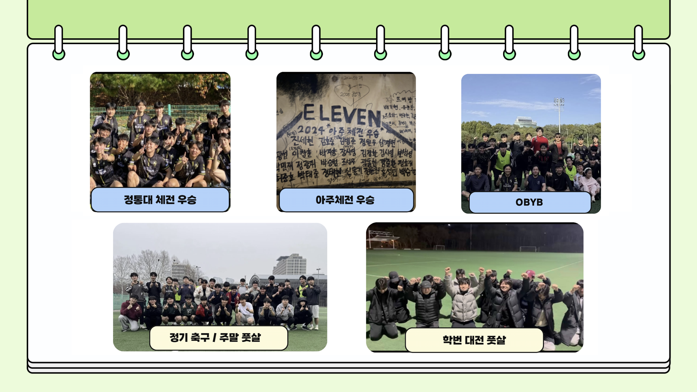 - 학기 중 여러 활동을 통해 선배와 후배, 동기들끼리 다양한 만남의 자리를 마련하여 축구를 하지 않는 재학생들도 일레븐에 대한 소속감을 느낄 수 있습니다.