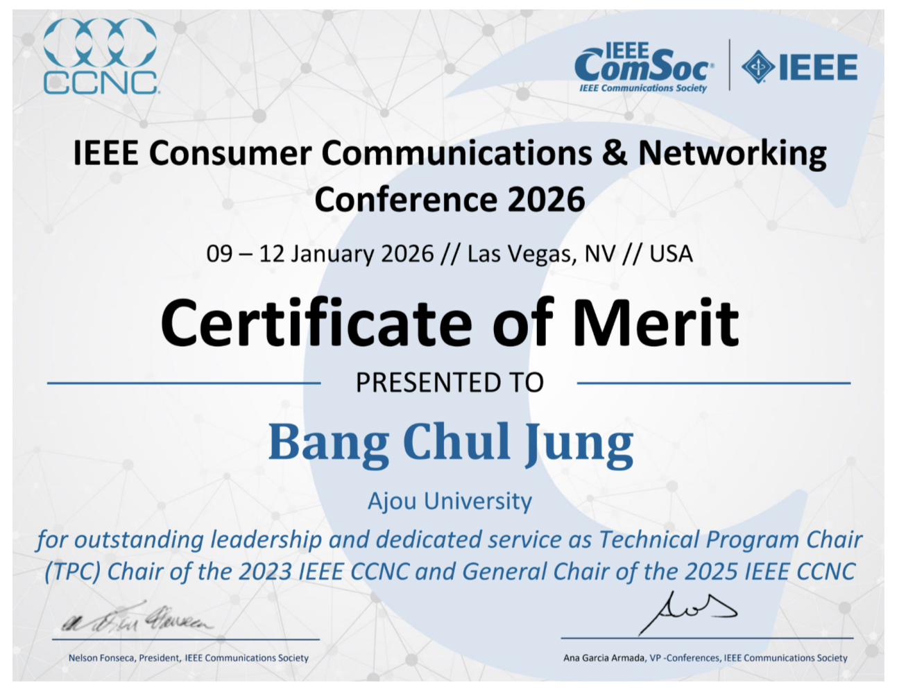 ▲무선통신 ▲신호처리 ▲정보이론 등을 연구하고 있는 정방철 교수는 CCNC에서 꾸준히 여러 역할을 맡아온 점을 인정받아 공로상을 수상했다. 정 교수는 2025년 학회장(General Chair)을 맡이 일했고, 2023년에는 기술 프로그램 위원장(Technical Program Committee / TPC Chair)으로 참여했다. 2019년부터 3년 동안은 기술 프로그램 트랙 위원장(TPC Track Chair)으로서의 역할을 수행했다. 정 교수는 올해에도 수상 심사 위원장(Award Chair)을 맡았다.