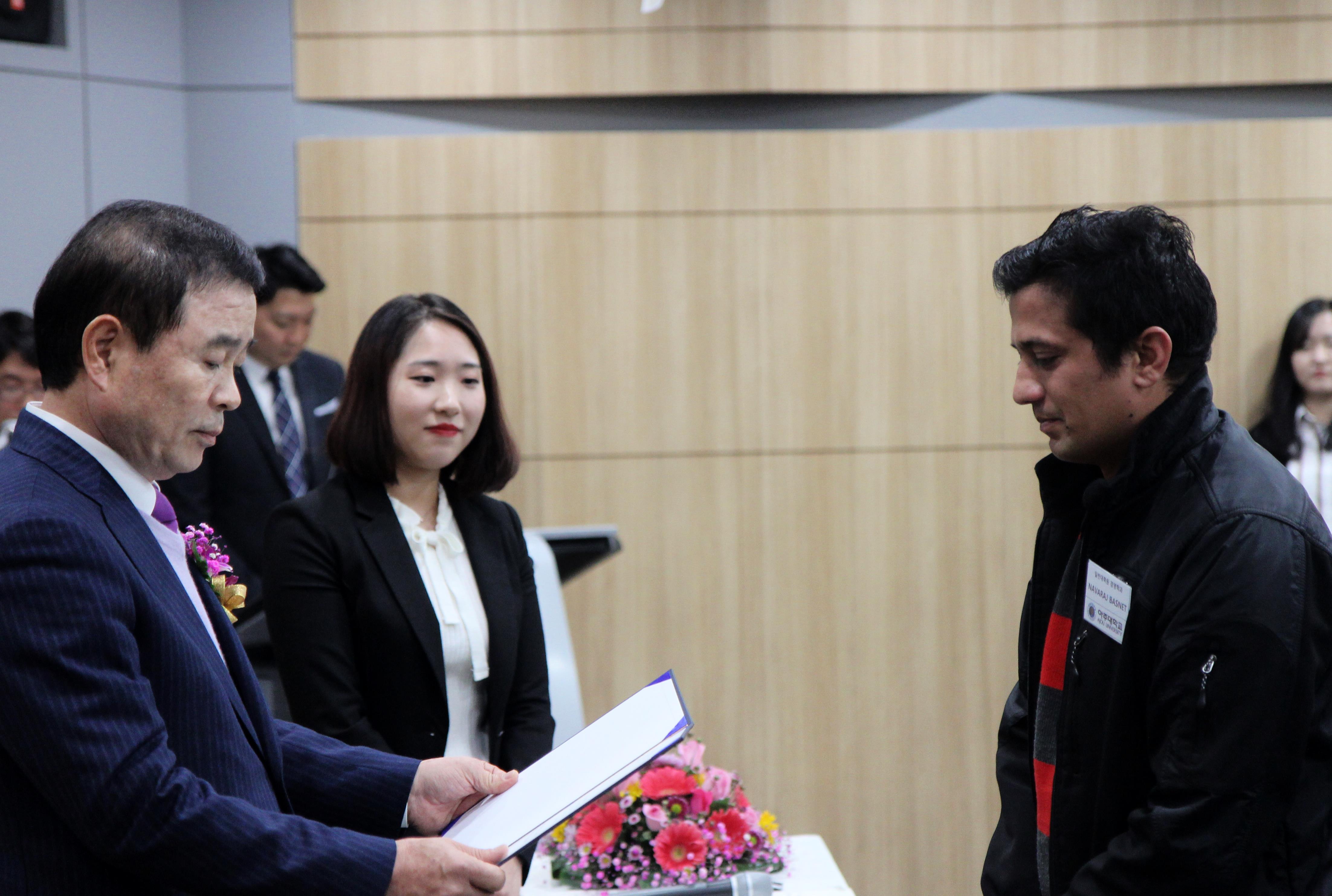 2017학년도 2학기 아경장학재단 장학증서 수여식이 21일 율곡관 영상회의실에서 열렸다. 올 2학기에는 27명의 학생이 아경장학재단 장학생으로 선정됐다.이날 행사에는 김형균 아경장학재단 이사장을 비롯한 아경장학재단 이사진과 유희석 총장직무대행을 비롯한 우리 학교 관계자들이 참석했다. 김형균 아경장학재단 이사장은 선발된 장학생들에게 장학증서를 전달하고 격려했다. 이번 학기에는 총 27명의 학생에게 6500만원 상당의 장학금 혜택이 돌아갔다. 아경장학재단은 경영대학원 총동문회가 2007년 설립한 장학재단으로 그동안 학생 장학금과 학술 세미나 지원, 연구 지원, 교육여건 개선 등을 위해 우리 학교에 꾸준히 기부해왔다.◆아경최고장학 박새벽(법학전문대학원), 주정운(화학공학과), 이성훈(소프트웨어학과), 최두헌(수학과), 노윤지(경영학과), 이은영(국어국문학과), 박찬비(심리학과), 이건형(의학과), 임준아(간호학과)◆아경비전장학국종화(경영대학원), 조은별(경영대학원)◆글로벌장학Timbate Lukas Beyashe(대학원 경영학과), Haile Teggne Tesfaye(대학원 경영정보학과), 리우위첸(경영학과), 왕이(경영학과), 유운비(경영학과), 주영걸(경영학과), 조증군(경영학과), 만주라(경영학과), 바야르(경영학과), 반월(경영학과), 황나(경영학과), 이몽팅(경영학과)◆일반장학NAVARAJ BASNET(대학원 경영학과), 최지훈(경영대학원)◆석사52기 장학이지헌(경영학과), 노영지(e-비즈니스학과)