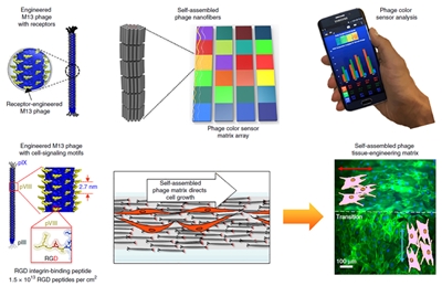 >진효언(약학대학, 사진 좌측) 교수가 자연계에서 생명현상을 유지하는 데에 중요한 역할을 하는 나노 구조들을 공학적으로 쉽게 만들 수 있는 기술을 개발해냈다. 이승욱 버클리 캘리포니아주립대 교수와 공동으로 수행한 이번 연구는 ‘Production of tunable nanomaterials using hierarchically assembled bacteriophages’란 제목으로 ‘네이처 프로토콜(Nature Protocols)’에 게재되었으며 생물학연구정보센터(BRIC)가 발표하는 ‘한국을 빛내는 사람들(한빛사)’에 선정되기도 했다. 자연계에는 다양한 주기적인 나노 구조들이 존재하는데, 이런 나노 구조들은 단순한 구조의 하나의 기본 단위체가 조립되어 많은 종류의 생체 내 핵심 구조물을 만들어내는 것으로 알려져 있다. 우리 몸의 주요 구성 단백질인 콜라겐(collagen)이 대표적인 예이다. 콜라겐은 콜라겐 분자들의 서로 모여 자기조립(self-assembly) 방식을 통해 독특한 형태의 구조들을 만들어 냄으로써, 우리 몸에 필수적인 기능인 생리학적, 기계적, 광학적 성질을 제공한다. 연구진은 콜라겐과 유사한 표면 나선구조를 갖는 인체에 무해한 바이러스인 ‘박테리오파지’를 기본 단위체로 이용했다. 박테리오파지를 포함한 수용액에 실리콘이나 유리 등을 담갔다가 적정속도로 빼주면, 용액과 실리콘 표면의 계면에서 박테리오파지 입자가 자기조립 방식을 통해 박막 형태의 나노 구조물을 형성하는 기술이다. 박테리오파지 입자의 농도, 표면의 화학적인 성질, 박막 형성시간 등을 조절하여, 자연계에서 동물과 식물에 존재하는 구조체와 유사한 나노 구조를 다양하게 만들어 낼 수 있다. 이를 통해 연구진은 박테리오파지의 표면에 원하는 펩타이드 작용기를 도입하여 다양한 기능성 재료를 제작하여, 바이오센서 및 뼈조직과 유사한 인공 조직체를 개발했다. 진 교수는 “자기조립은 현대과학으로 완전히 풀지 못한 난제(難題)로 꼽히며, 그 메커니즘 연구는 분자 간 상호작용에 대한 이해를 뛰어넘어 생명활동에서 일어나는 복잡한 현상을 이해하는데 도움을 주고, 나노 물질과 구조를 만드는 방법을 제공하는 등 점점 다양한 분야에서 사용되고 있다”며 “개발한 기술을 이용하여, 질병 발병의 근본 원리를 밝히는 것은 물론 다양한 생체모방(biomimetic) 나노 구조들을 손쉽게 재현할 수 있어, 의약학 분야에 널리 활용 가능할 것”이라고 설명했다. 이번 연구는 미래창조과학부 이공분야 기초연구사업(신진연구자지원사업) 및 연구재단 일반연구교류지원사업의 지원을 받아 수행됐다.