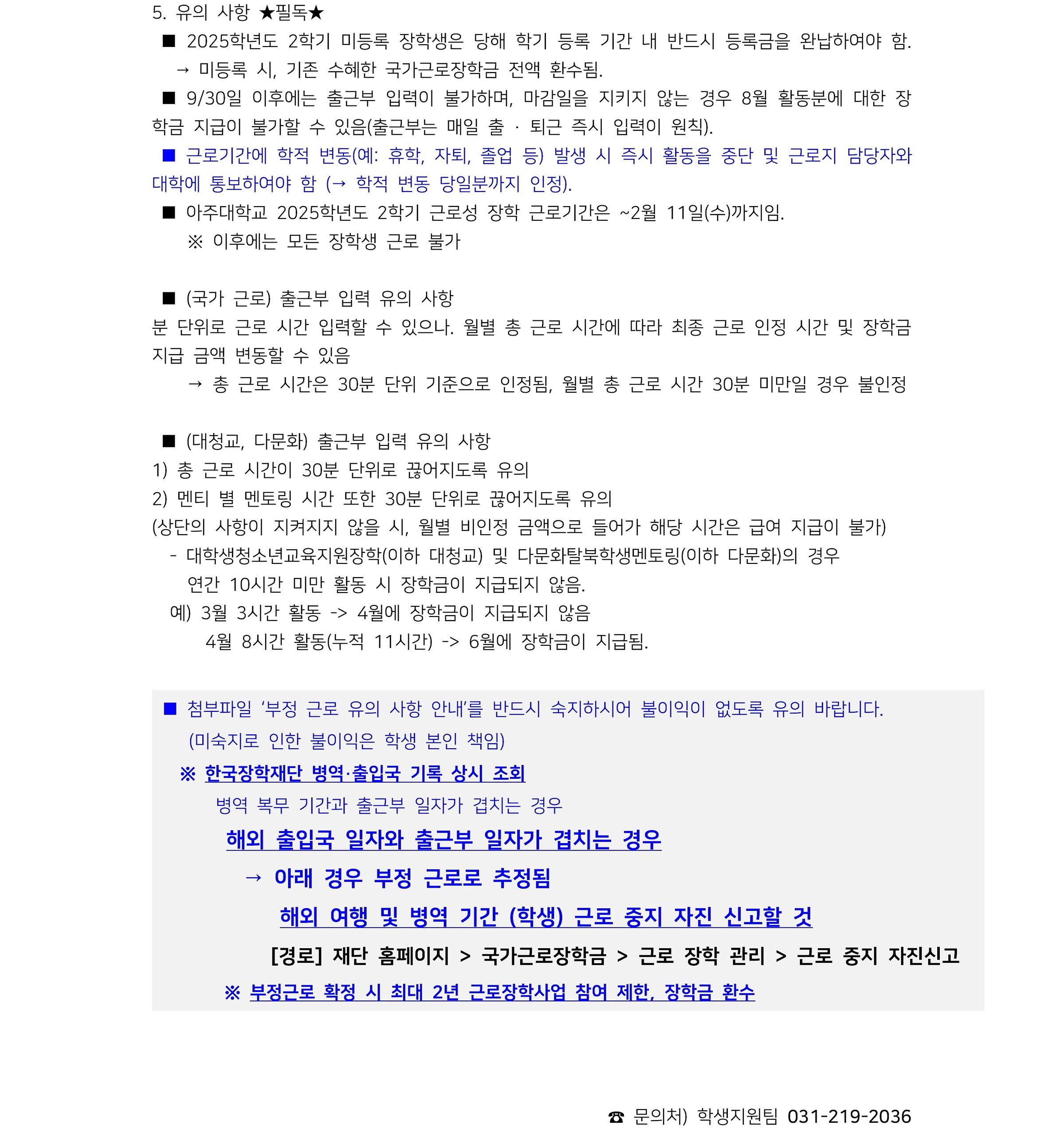 ※ 근로성 장학 최종 출근부에 따른 책임은 근로장학생 본인에게 있습니다.