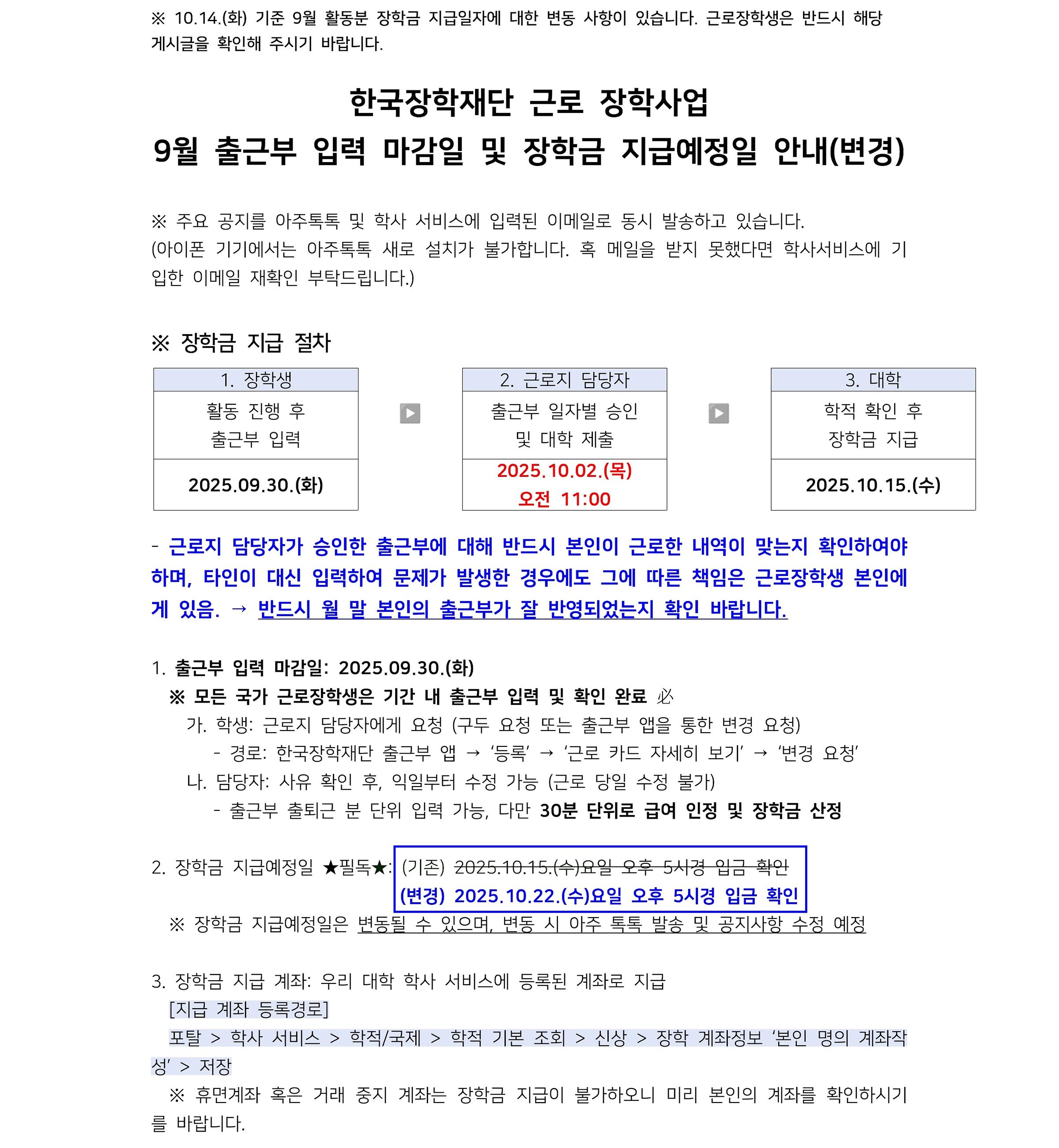 [장학] [학생지원팀] (10.14. 지급 일자 변경) 근로 장학 9월 출근부 입력 마감일 및 장학금 지급예정일 안내