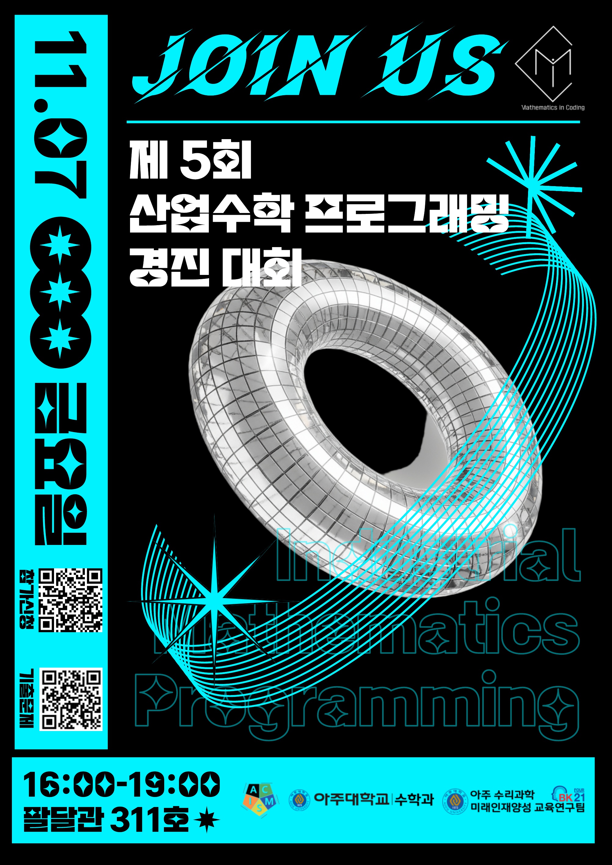수학과 소학회 MiC에서 4단계 BK21 아주 수리과학 미래인재양성 교육연구팀과 함께 재학생들의 창의적 문제해결력과 프로그래밍 역량 강화를 위한 『제 5회 산업수학 프로그래밍 경진대회』를 개최합니다.