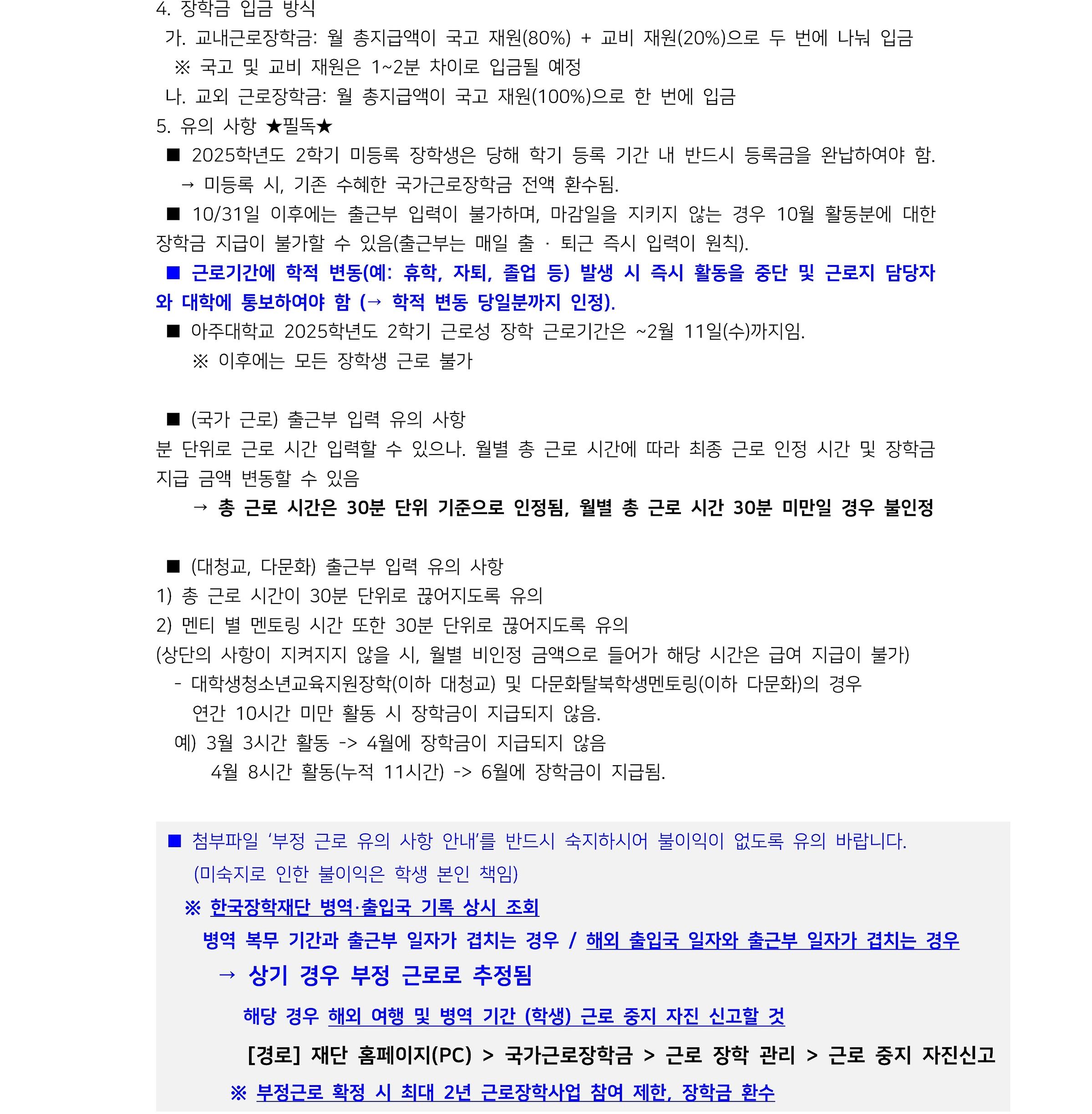 [장학] [학생지원팀] 근로성 장학 10월 출근부 입력 마감일 및 장학금 지급 예정일 안내