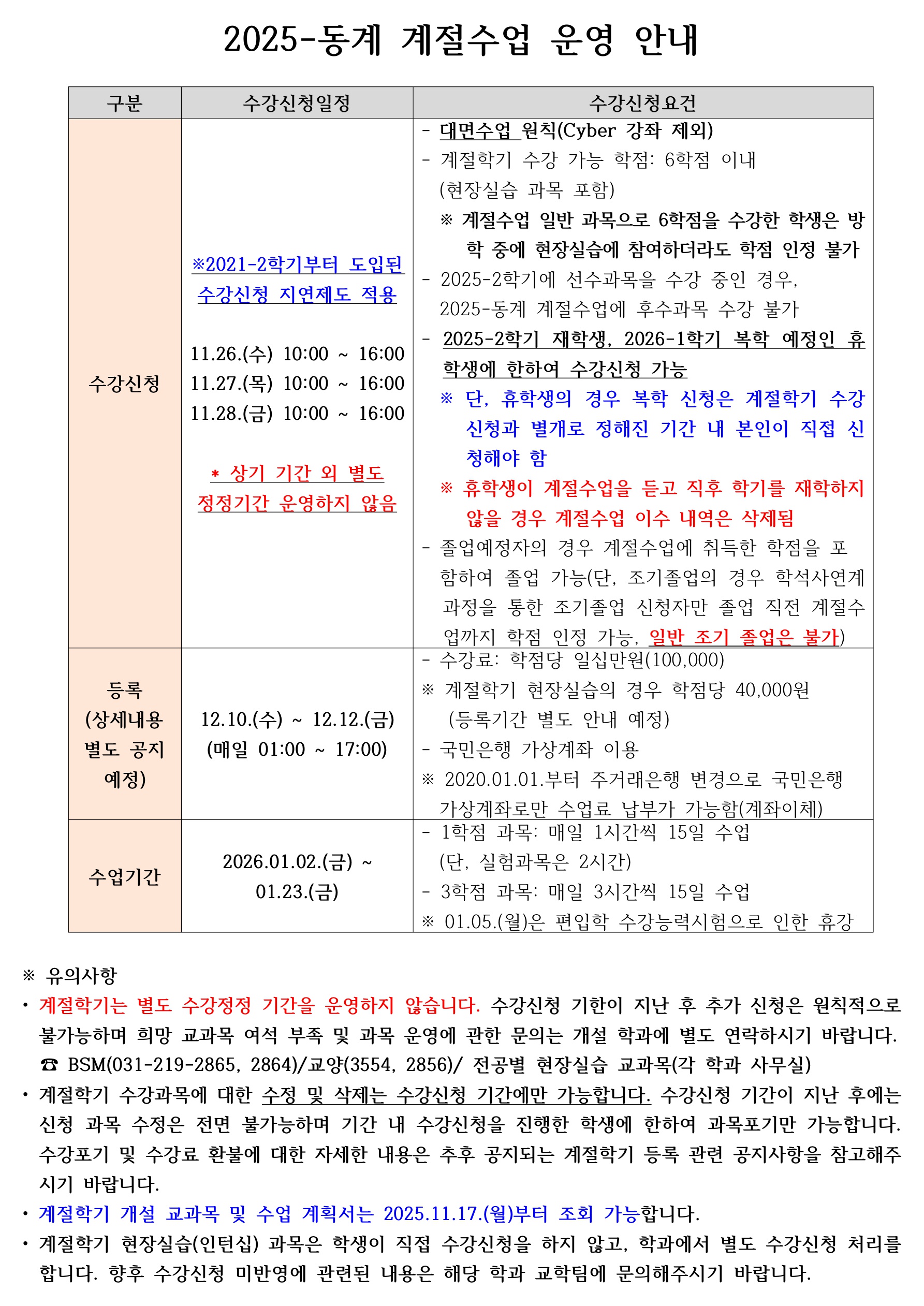 * 계절학기 관련문의 (031-219-2016, 교무팀), 개설과목 관련 문의 (개설학과 교학팀)
