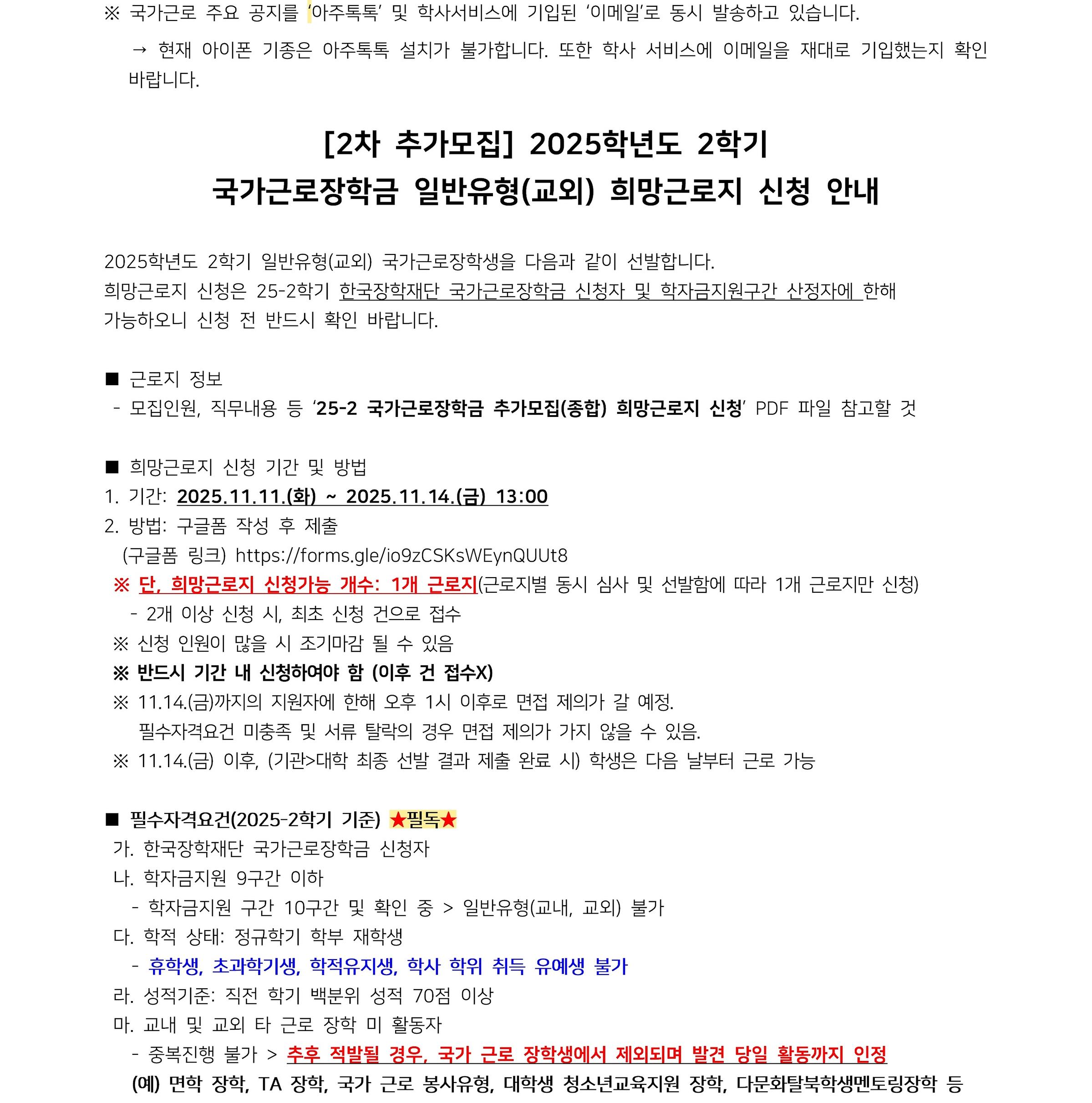 [장학] [학생지원팀](지원 현황 11.14.)2025-2학기 국가근로장학금 추가 선발 희망근로지 신청 안내(~11.14. 13:00)