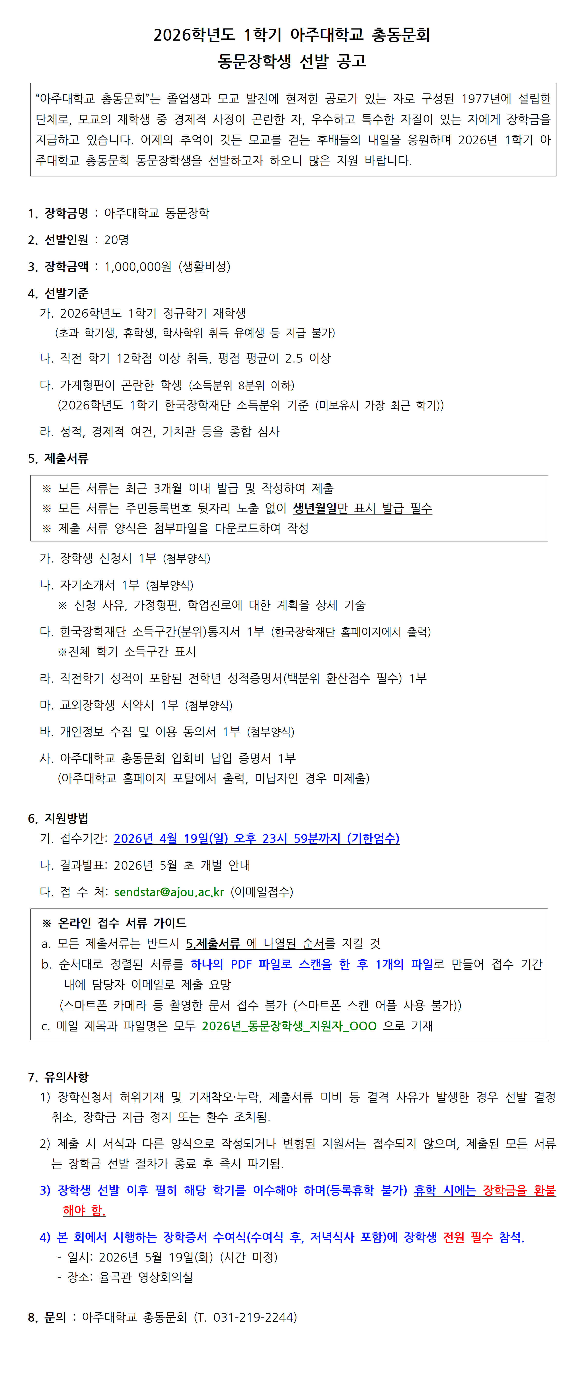 [장학] [교외장학] 2026학년도 1학기 아주대학교 총동문회 동문장학생 선발 공고