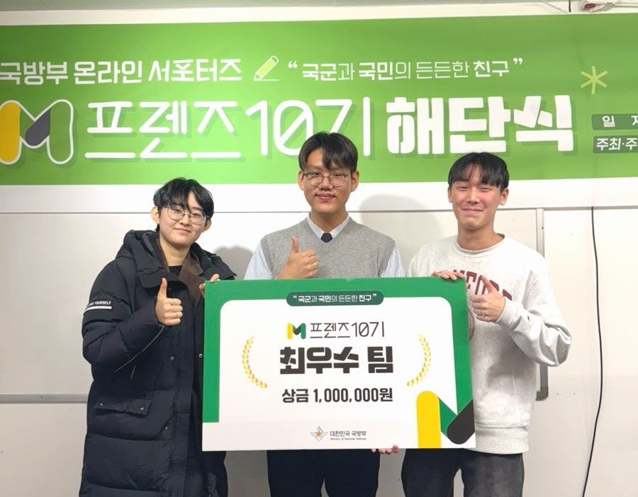 박병하 학생(국방디지털융합학과 2학년)은 지난 12월 ‘국방부 온라인 서포터즈’로서 활발히 활동한 점을 인정받아 국방부장관상을 받았다. 박병하 학생은 타 대학 학생 5명과 팀을 꾸려 2025년 4월부터 12월까지 서포터즈로 활동하면서, 국방 정책 및 현장과 관련한 다양한 콘텐츠를 제작했다. 활동한 서포터즈 가운데 최우수 활동팀으로 선정되어, 국방부장관상을 수상하게 됐다.