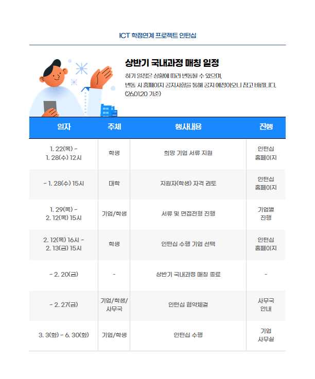 [공지] 2026년 상반기 ICT 학점연계 프로젝트 인턴십(국내과정) 참여신청 안내(~01.28 수요일 낮12시까지)