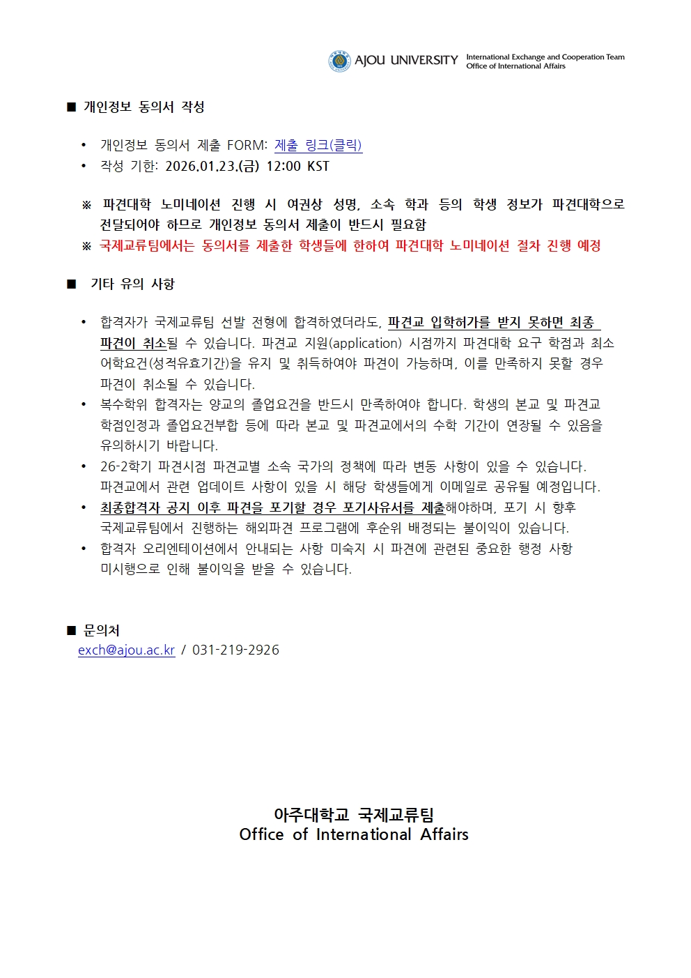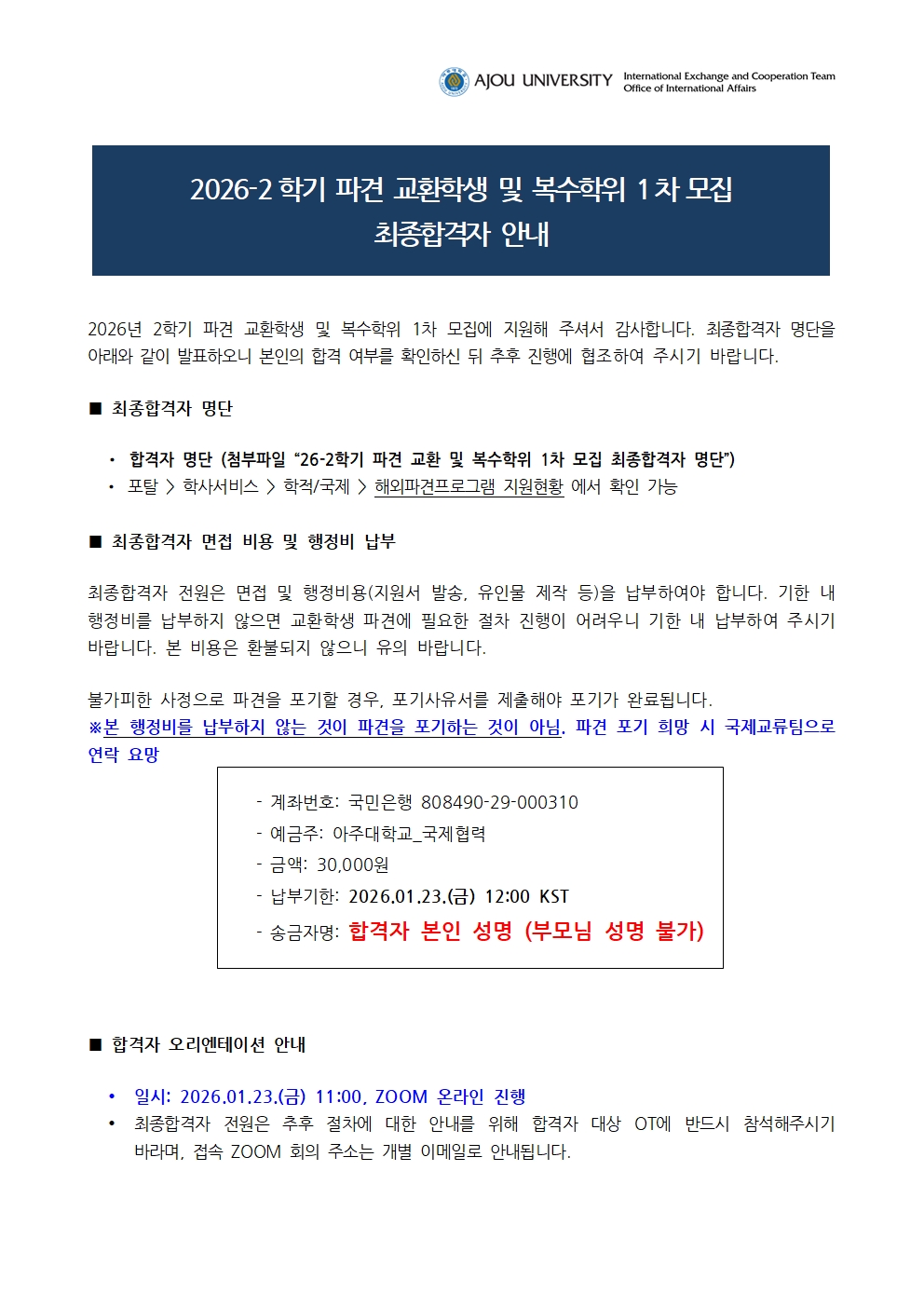 [공지] 2026-2학기 파견 교환 및 복수학위 1차 모집 최종합격자 공고